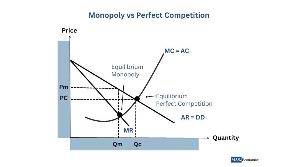 This graph compares a monopoly’s higher price (Pm) and lower quantity (Qm) with perfect competition (Pc and Qc). Monopolies earn supernormal profits due to their pricing power, represented by the shaded area.