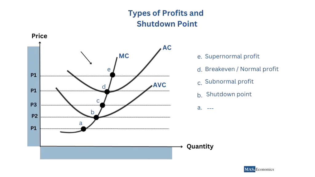- Subnormal profit or economic losses: Arises when the price is lower than average total cost or when total revenue is less than total cost.